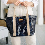 The multi-functional tote is lightweight and made from a combination of washable paper, cotton, and leather. This design has one internal zipped pocket and a magnetic closure. Use as your daily tote bag, travel bag, work or parent bag. So many uses and now in three great sizes!