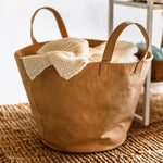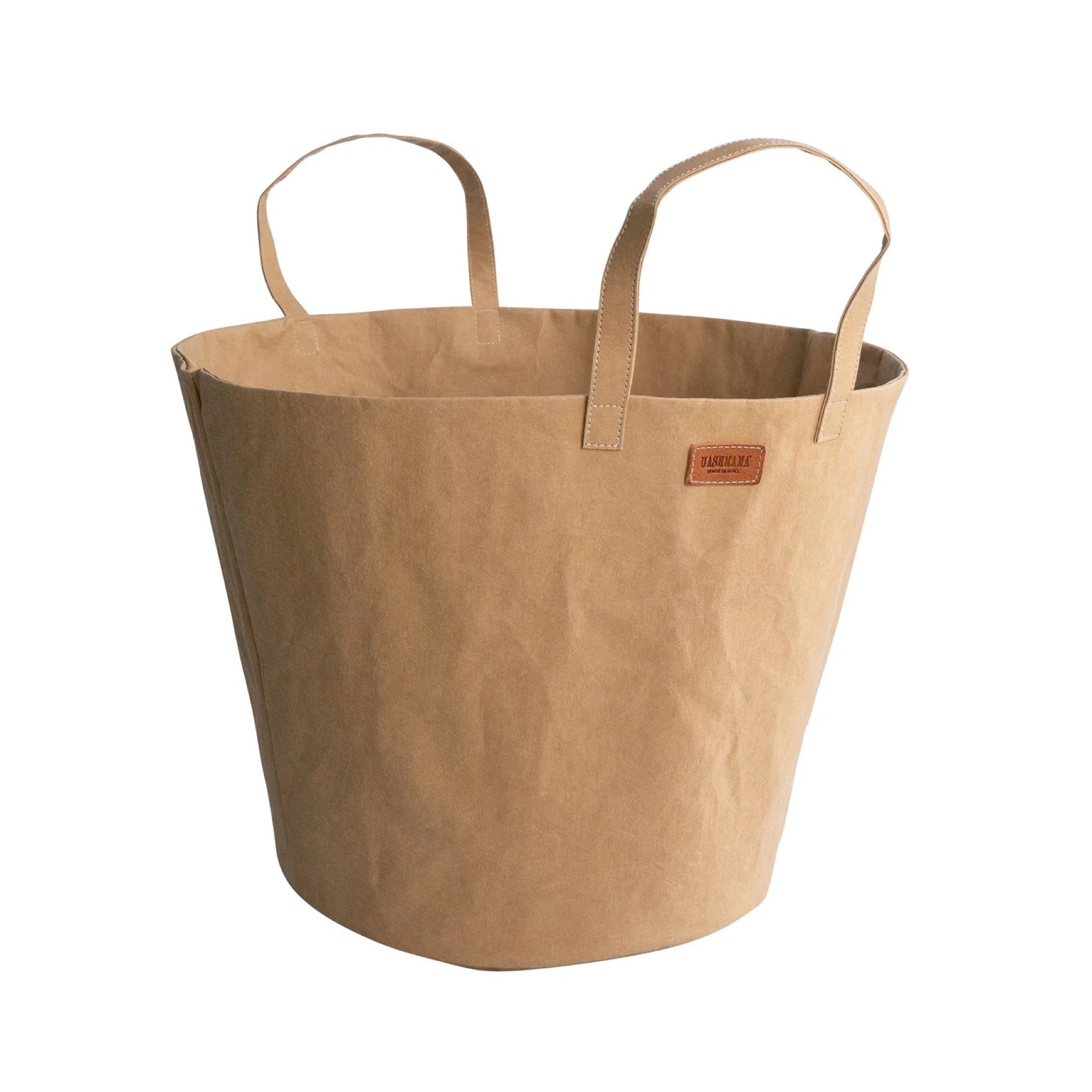 A washable paper basket with two top handles is shown in a fireplace, holding foliage. It is shown in a tan colour.