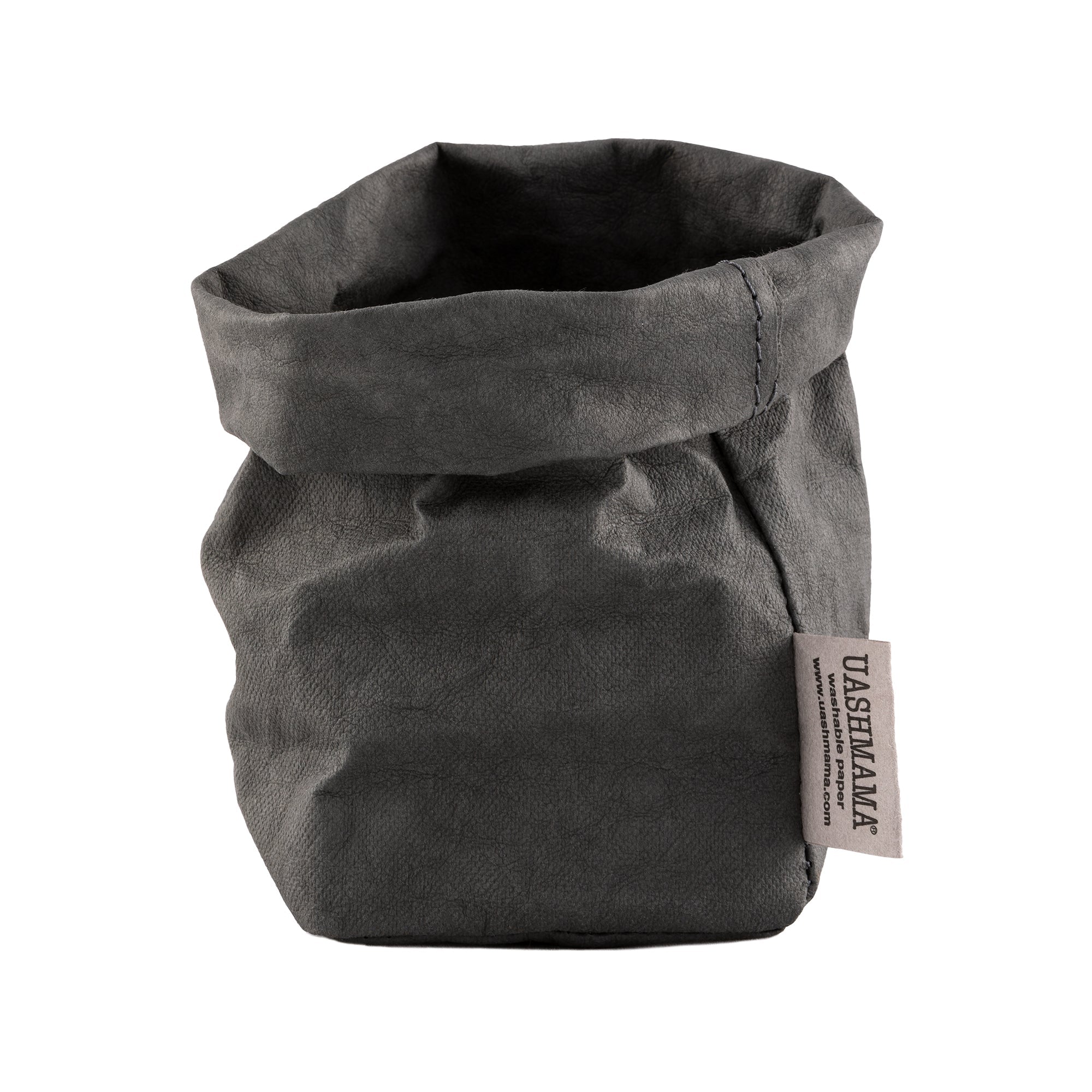 A washable paper bag is shown. The bag is rolled down at the top and features a UASHMAMA logo label on the bottom left corner. The bag pictured is the piccolo size in dark grey.