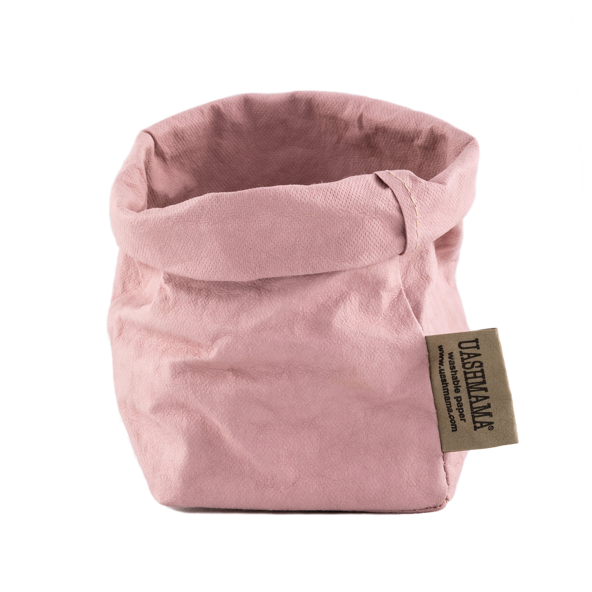 A washable paper bag is shown. The bag is rolled down at the top and features a UASHMAMA logo label on the bottom left corner. The bag pictured is the piccolo size in pale pink.