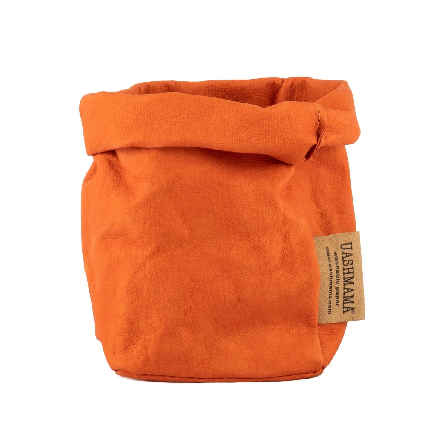A washable paper bag is shown. The bag is rolled down at the top and features a UASHMAMA logo label on the bottom left corner. The bag pictured is the piccolo size in tan.