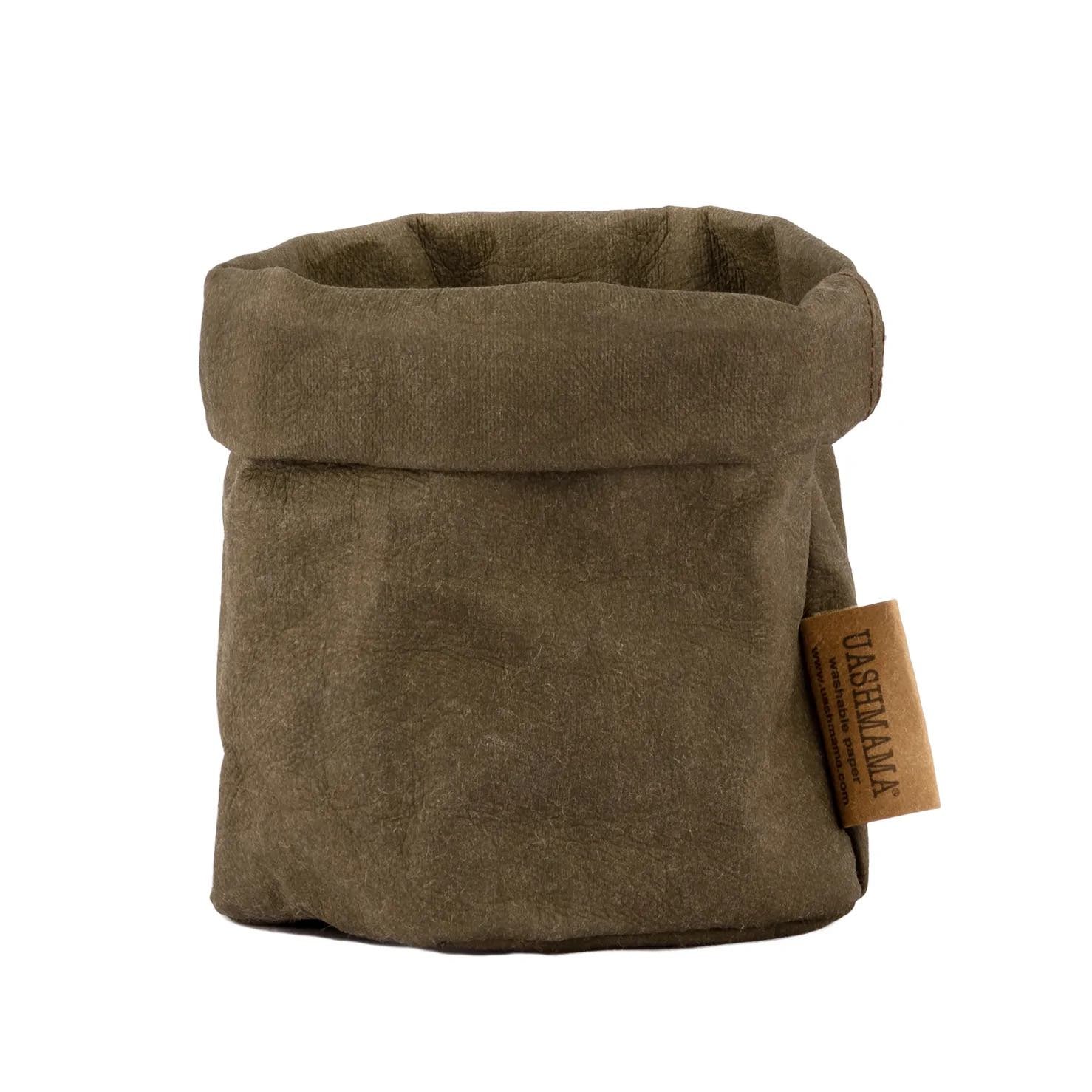 A washable paper bag is shown. The bag is rolled down at the top and features a UASHMAMA logo label on the bottom left corner. The bag pictured is the piccolo size in dark green.