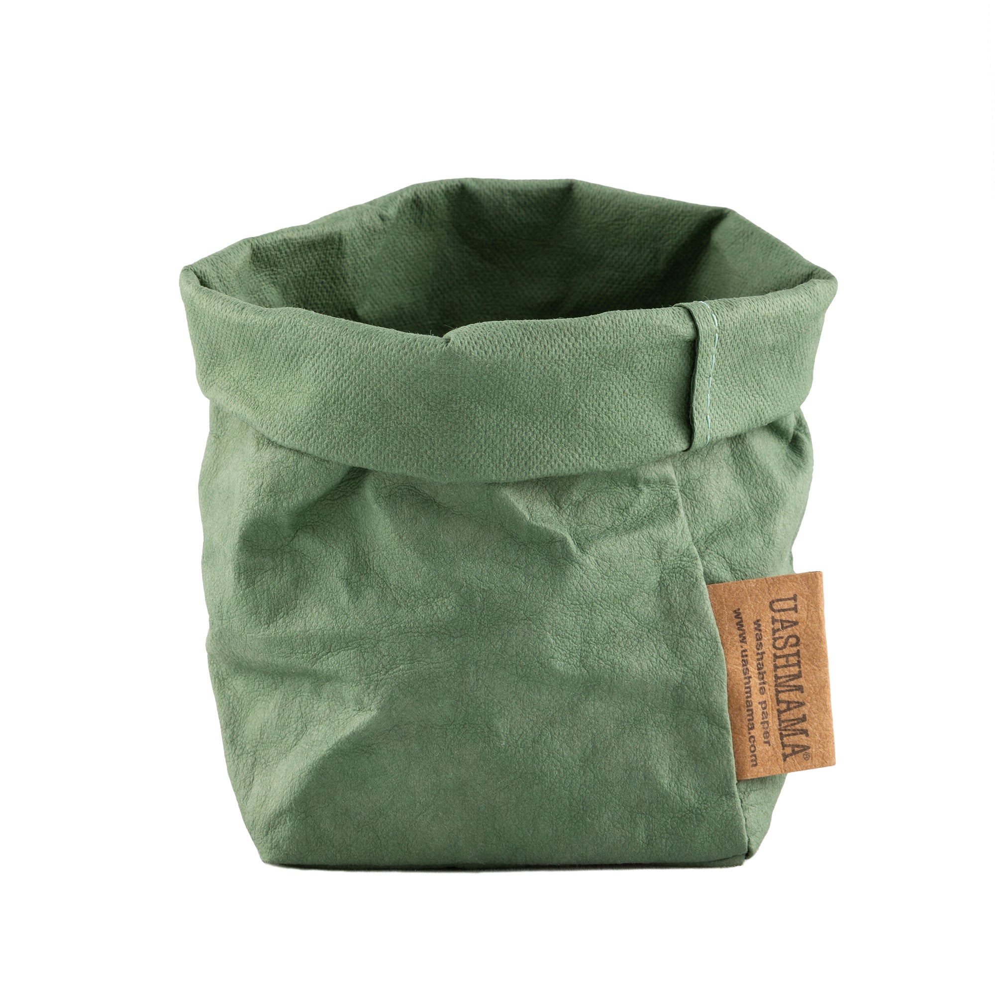 A washable paper bag is shown. The bag is rolled down at the top and features a UASHMAMA logo label on the bottom left corner. The bag pictured is the piccolo size in green.