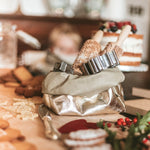A washable paper bag is shown. The bag is rolled down at the top and features a UASHMAMA logo label on the bottom left corner. The bag pictured is the medium size in metallic platinum. Next to the bag lies a bundle of herbs. On the wall above a linen tea towel is draped.