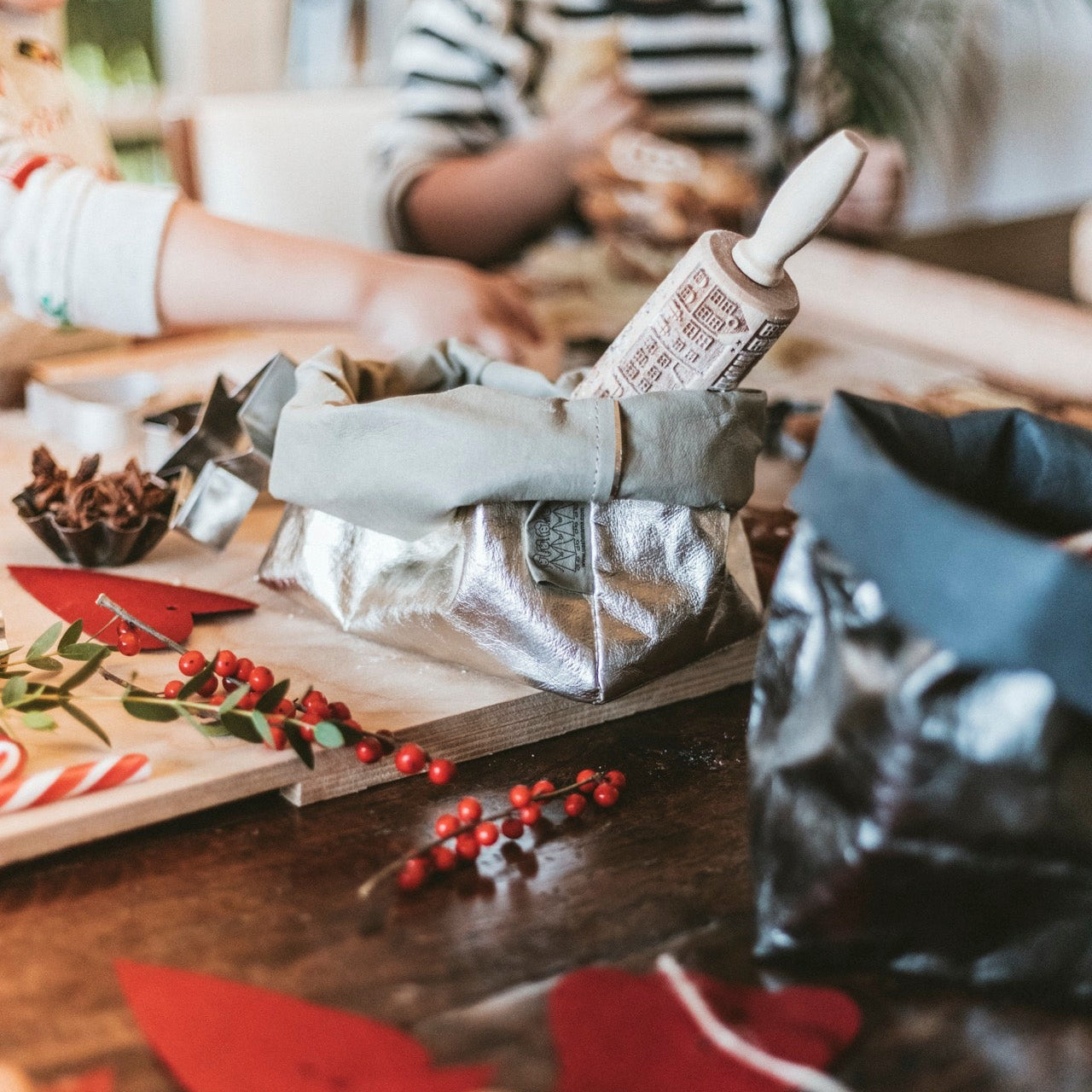 A small washable paper bag is shown in metallic silver. The bag contains a small metal whisk. Leaning up against the wall in the background is a wooden chopping board. Also shown is a wooden rolling pin.